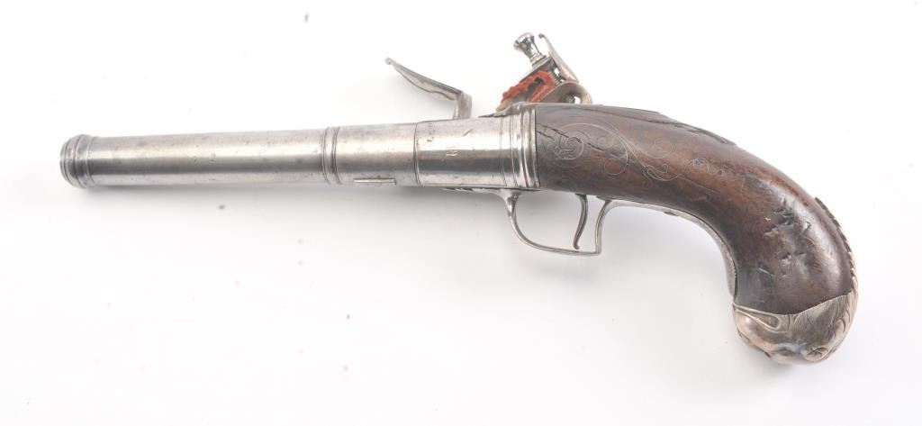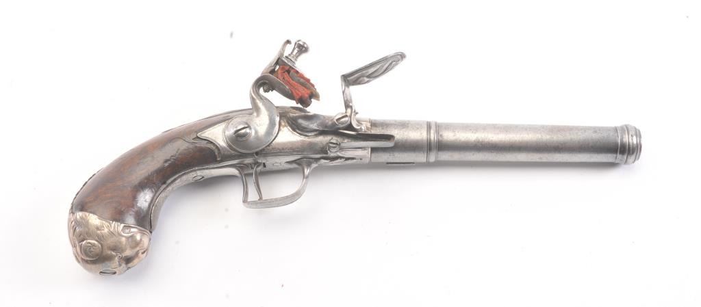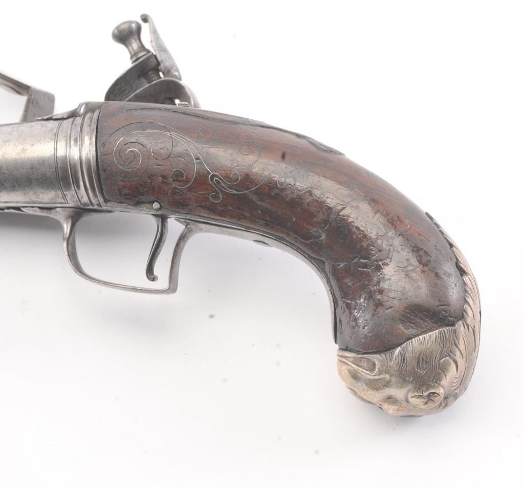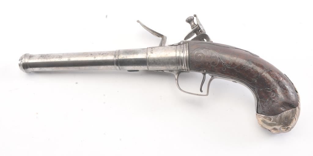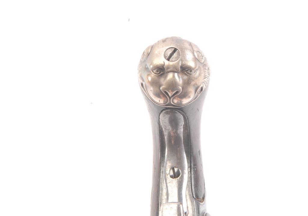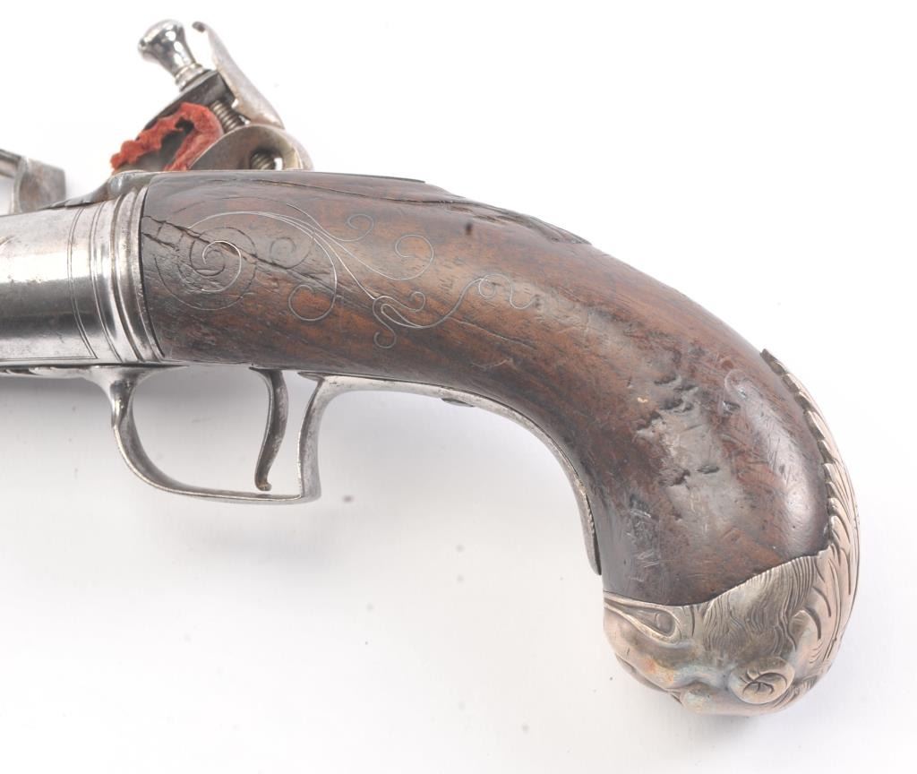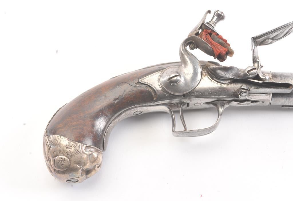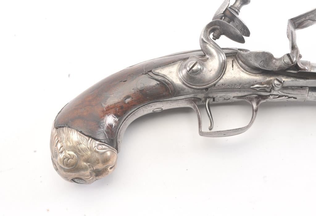 Early to Mid-18th century flintlock pistols signed "Le Maire" with fancy silver lion head butt caps and screw off cannon type barrels. Measures 10 3/4" overall and the barrels measure approximately 6 1/4" from muzzle tothe touch hole. Original flintlock parts. Some light cleaning with minor erosion, slight pitting and just normal metal age. The stocks show tight refinishing and minor restoration that is well done. The silvercaps are impressive and not rubbed out with small hallmarks that are illegible and typical French. (Antique) La Maire was a Huguenot maker that moved from France circa 1710. The pair shows the influence of both side of the channel. Est:$2500-5000