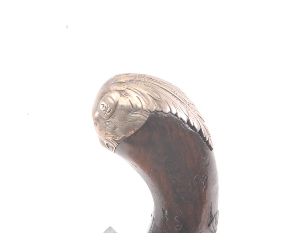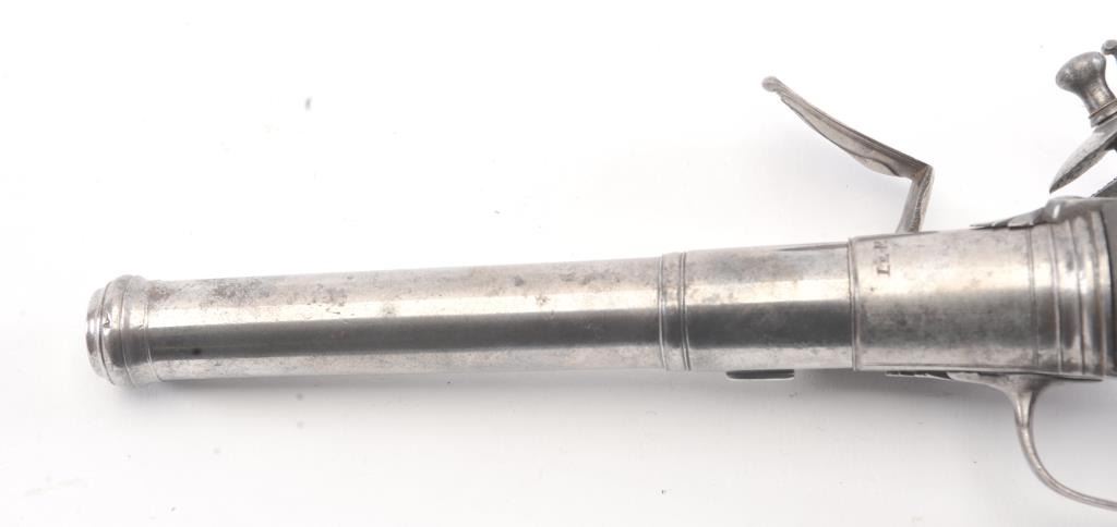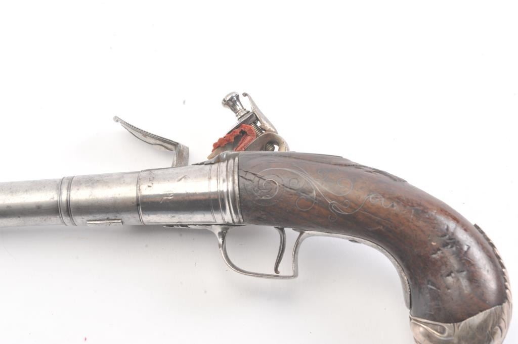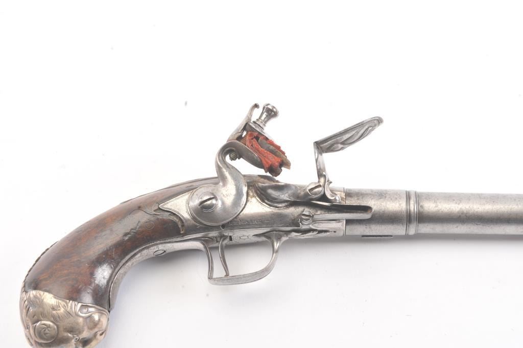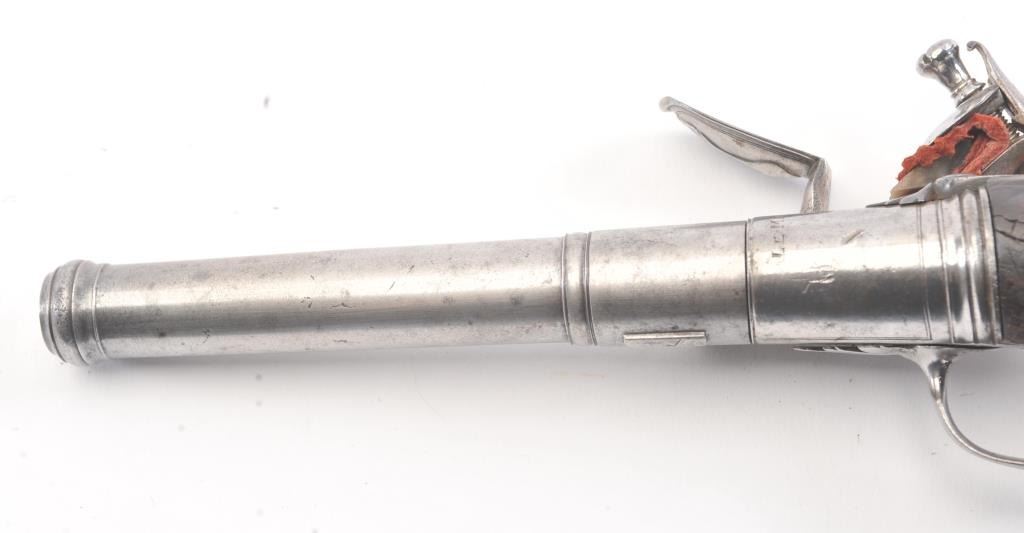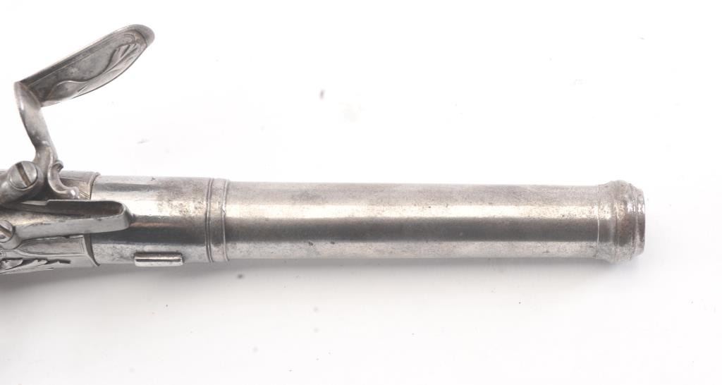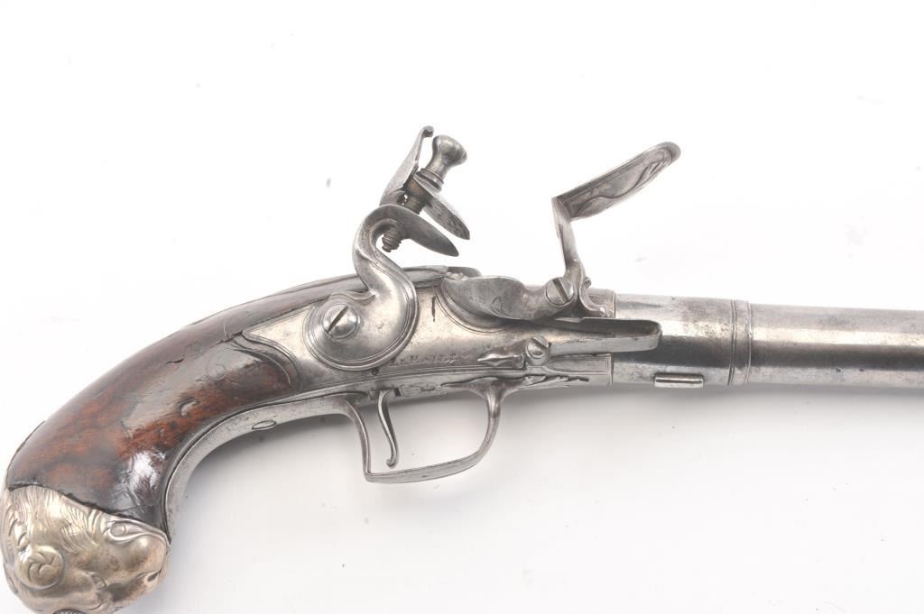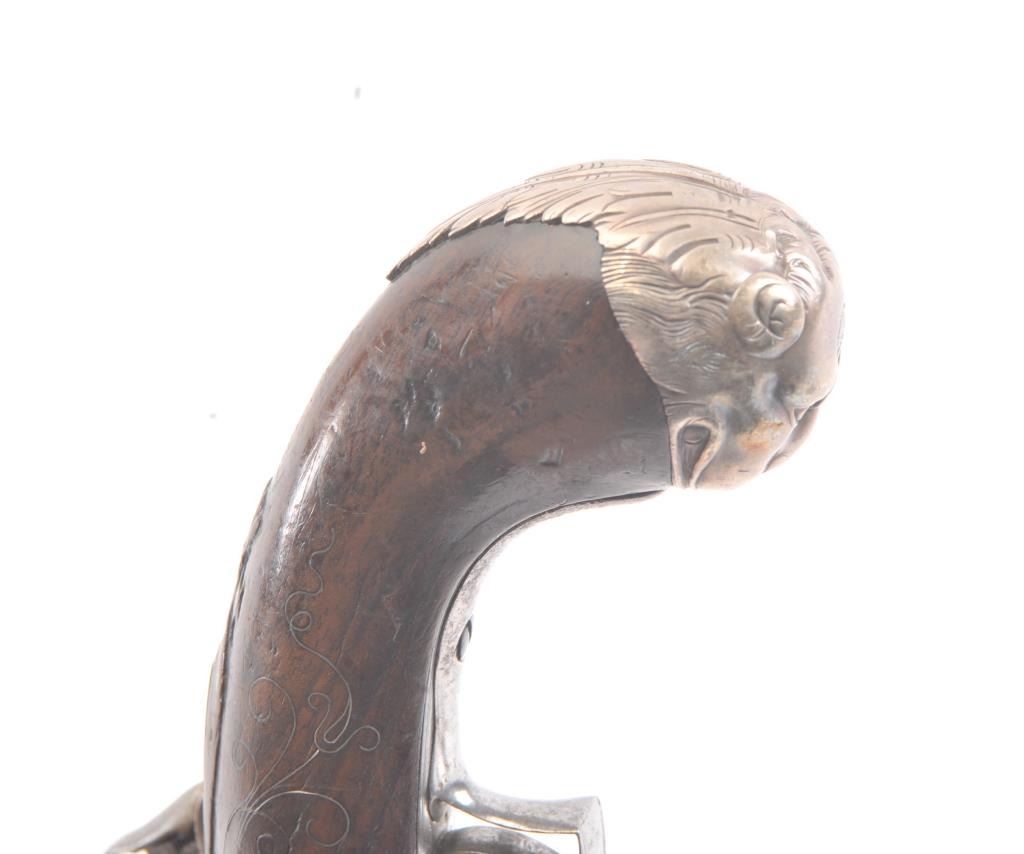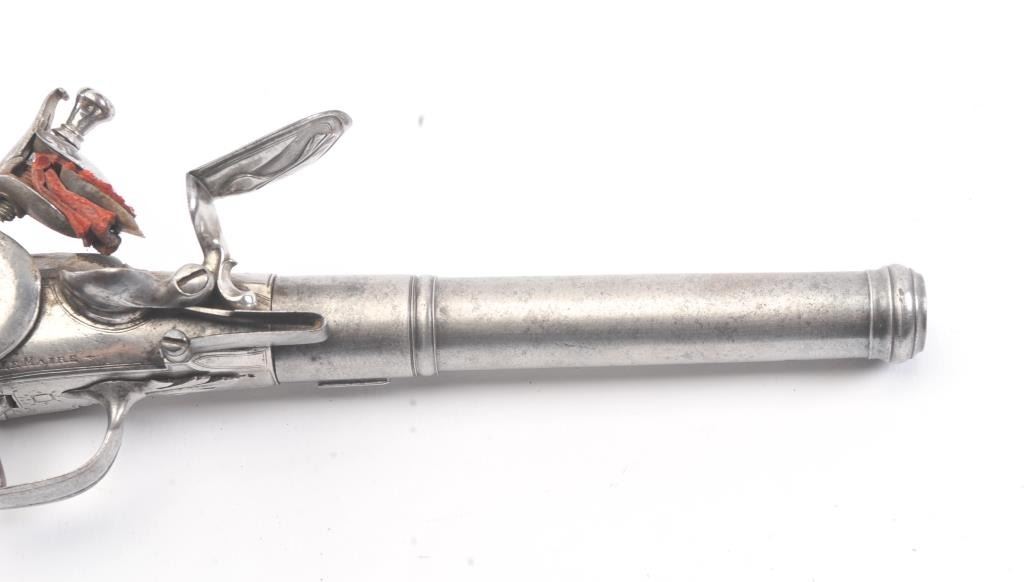 Early to Mid-18th century flintlock pistols signed "Le Maire" with fancy silver lion head butt caps and screw off cannon type barrels. Measures 10 3/4" overall and the barrels measure approximately 6 1/4" from muzzle tothe touch hole. Original flintlock parts. Some light cleaning with minor erosion, slight pitting and just normal metal age. The stocks show tight refinishing and minor restoration that is well done. The silvercaps are impressive and not rubbed out with small hallmarks that are illegible and typical French. (Antique) La Maire was a Huguenot maker that moved from France circa 1710. The pair shows the influence of both side of the channel. Est:$2500-5000