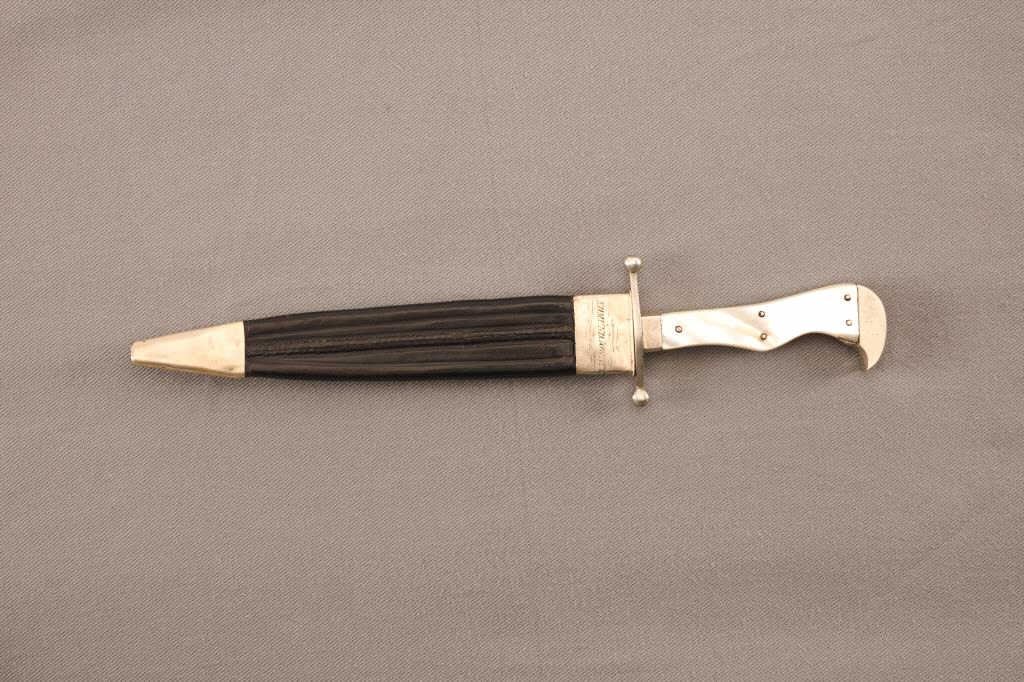 High quality spear point Bowie knife of Civil War era with odd finger grooves and pearl grip marked “Isaac Rapnes, Sheffield”. Original German silver mounted leather scabbard. Period script inscribed “EdmundJowett” on hilt and on scabbard throat. Re-enforced and very thick ricasso with well-made blade showing raised median ridge at center. Very good plus condition with minor polishing and aging. Almost finescabbard. Measures 12” overall with an 8” bladed. A collector’s quality Bowie circa 1850s-60s. Est.: $2000-$4000