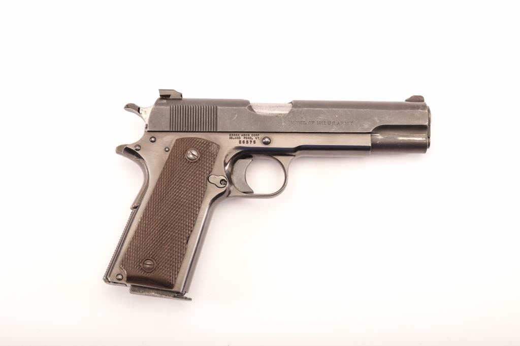 Custom .45 ACP 1911A-1 style pistol on Essex steel frame, S/N 56575. Colt 1911 slide and barrel with adjustable sights. Good to very good as reconditioned and refinished. (Modern) Est.: $600-$1200