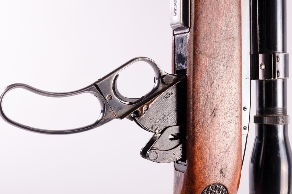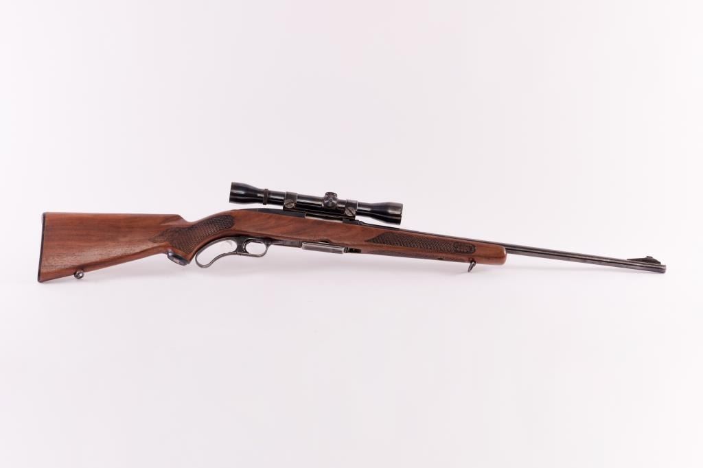 Winchester Model 88 .308 caliber lever action rifle mounted with Weaver K4 scope on Weaver mounts, S/N 32884. Factory mag with impressed checkered stock and 22” barrel with original butt plate and period slingswivels. Very good used condition. 80%-90% overall. Desirable. Est.: $400-$800
