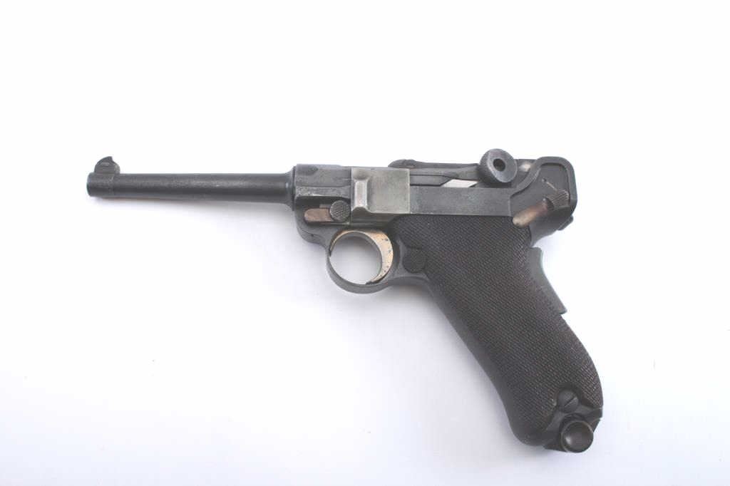Model 1900 American Eagle Luger in 30 cal. S/N 9803. Affidavits belonging to “Carbine Williams” from consignor. Gun is good to very good overall with 70-80% original blue has (cold blue touch-up on high points and sideplate). Good markings. Matching except mag. Bore is fair to good, has some cleaning to “straw parts”. A 7 on a 1-10 scale. Est.: $900-1,800