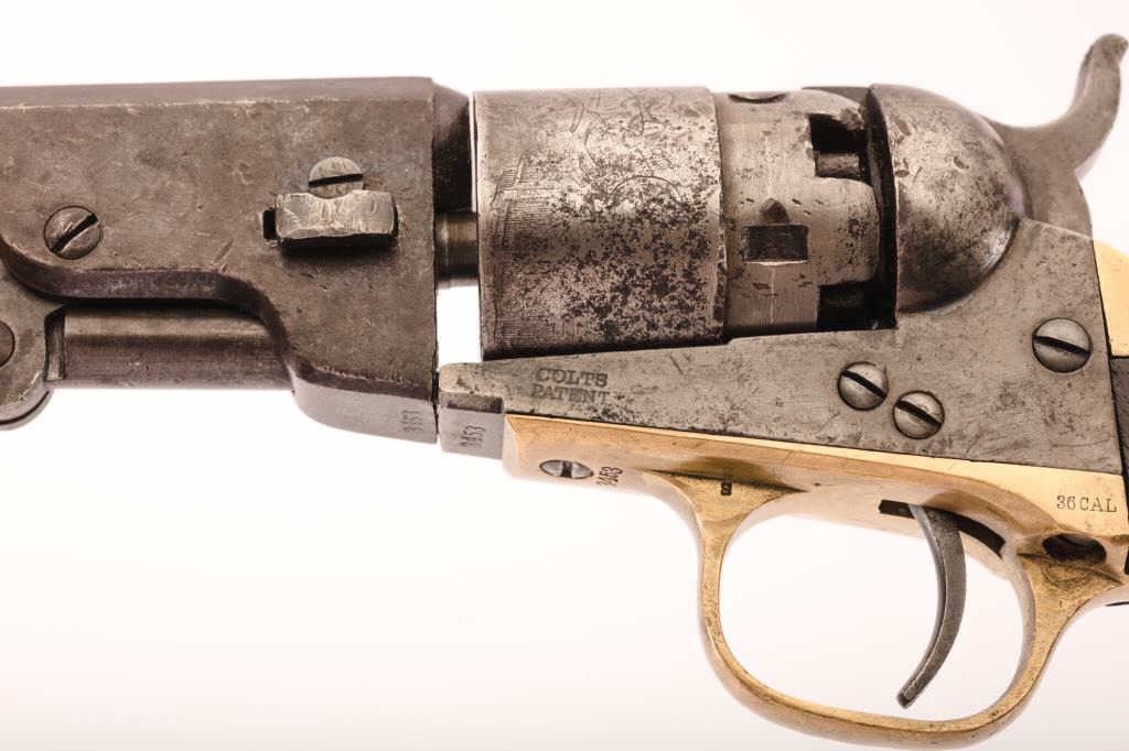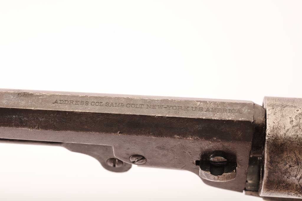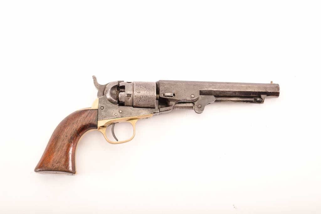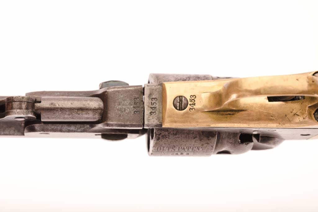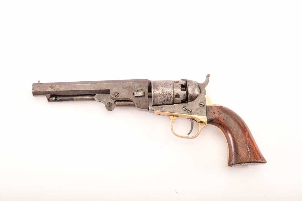 Colt .36 caliber pocket Navy with a 5 ½” barrel, S/N 3453 in good original condition. Traces of finish mixed with gray brown patina. Scattered light to moderate pitting. Matching numbers. 50%-60% cylinder scene. The grips show 60%-80% varnish. Some scratches and marks. Good action. A 6-7 on a 1-10 scale. Civil War era. (Antique) Est.: $700-$1400