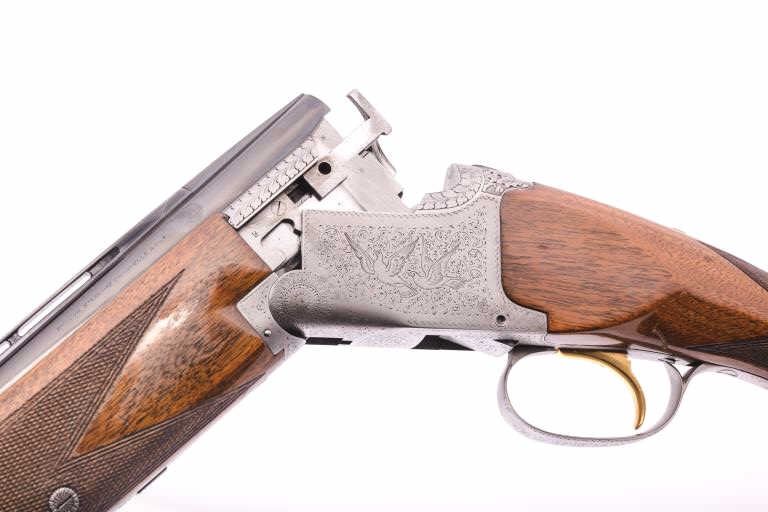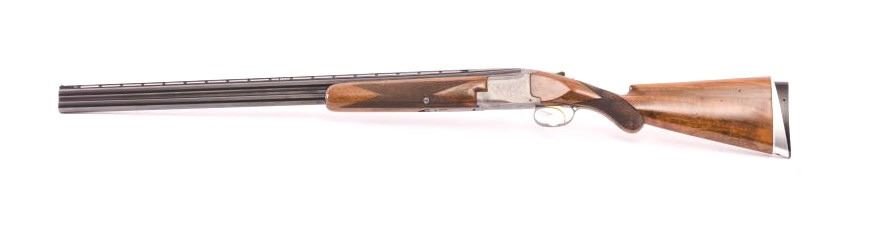 Belgian-made Browning Pigeon Grade O/U, long tang, round knob auto ejectors shotgun, 12 gauge, 30” ventilated rib barrels, engraved receiver, single trigger, adjustable butt plate missing rear portion of device,checkered wood stocks, S/N 22424; overall good to very good condition with majority of blued finish remaining on barrels, very good to near fine bores, wood stock shows a repair to the comb of the butt stock; accompaniedby a Leg of Mutton case. (Modern). Est.: $1,500-$2,500.