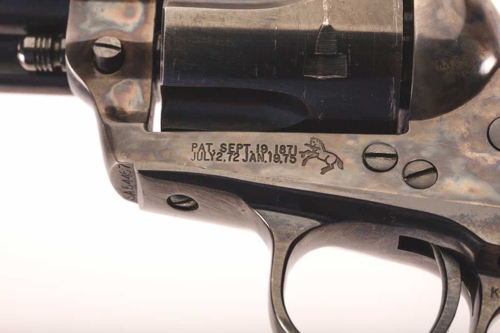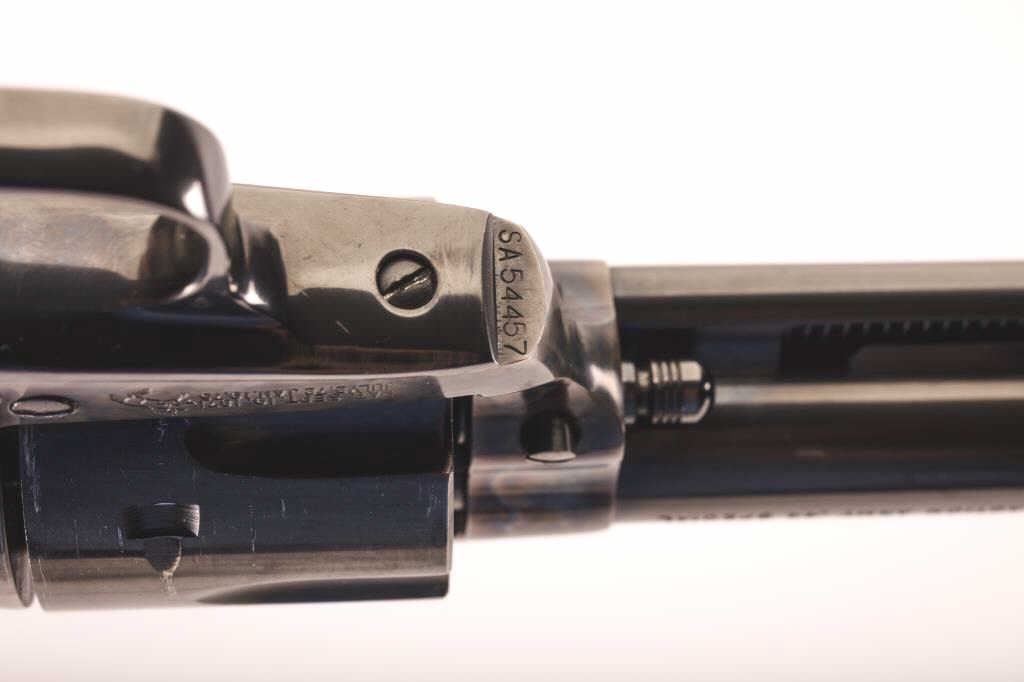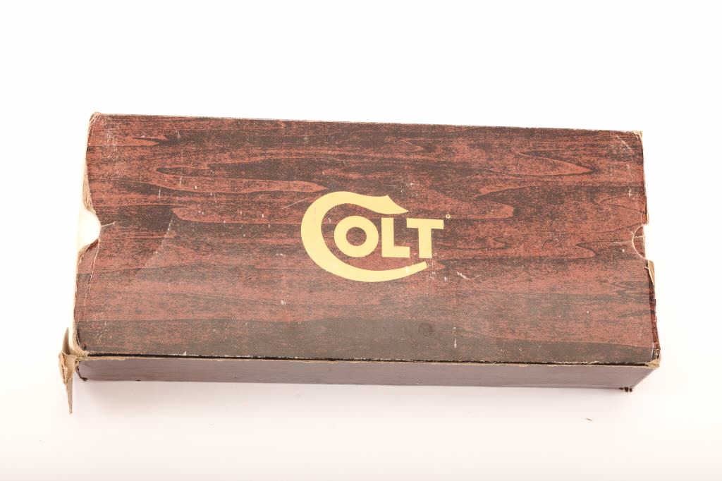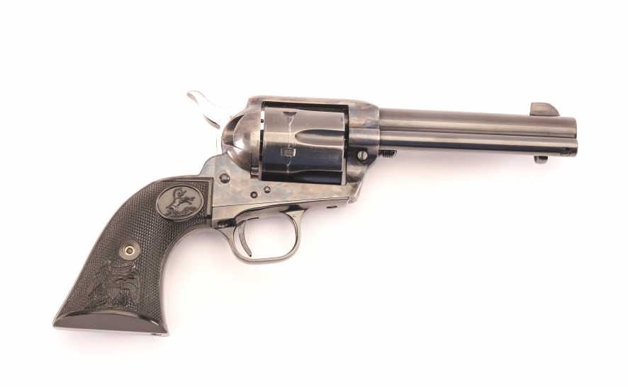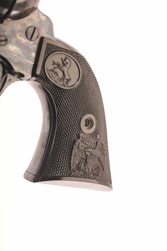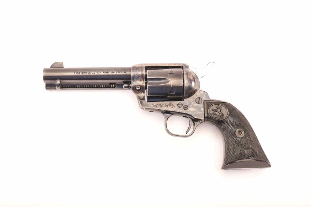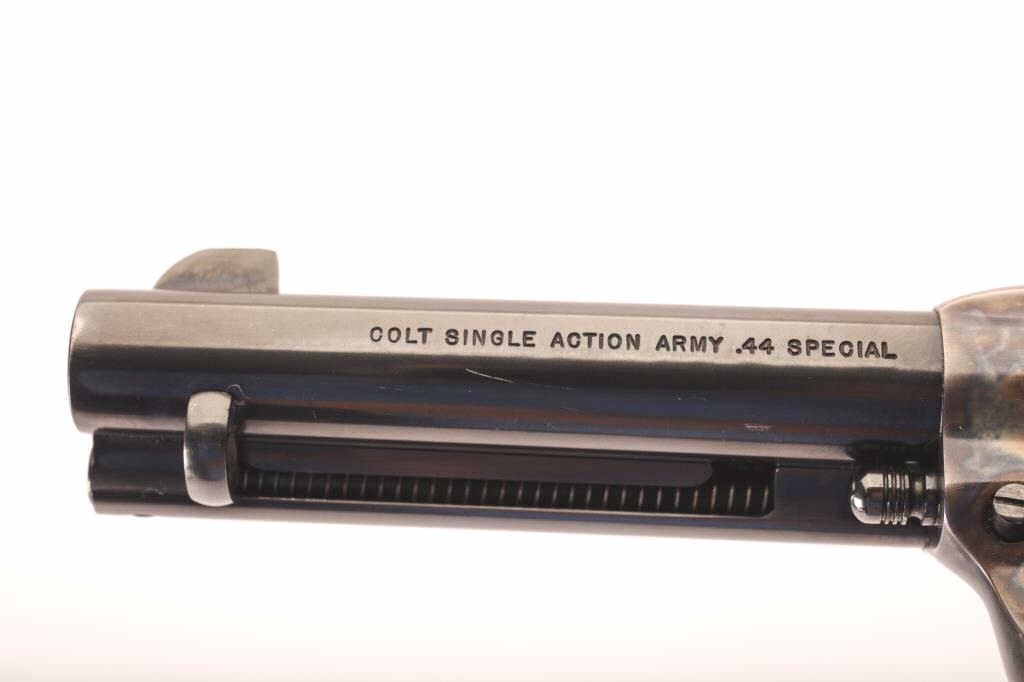 Colt Single Action Army revolver in .44 Special caliber with a 4 ¾” barrel, blue and case colored finish and hard rubber eagle grips, S/N SA54457.Action and front sight worked “End of Trails” champion shooter.90%-95%. In 3rd generation wood grain box. No single actions currently available from Colt and rising quickly in price. (Modern) Est.: $1000-$2000
