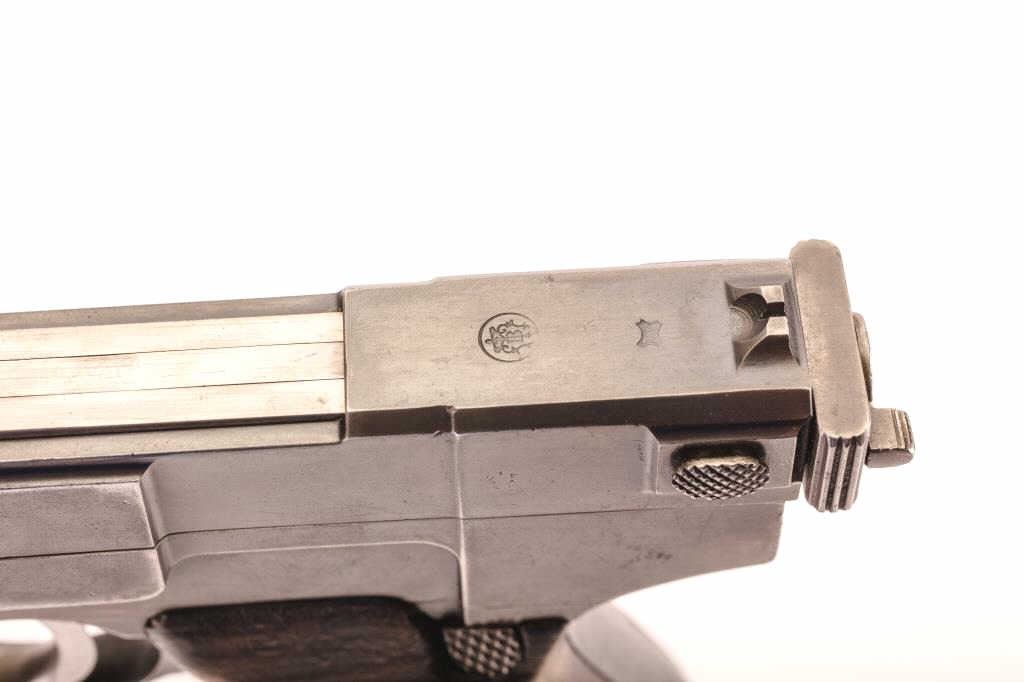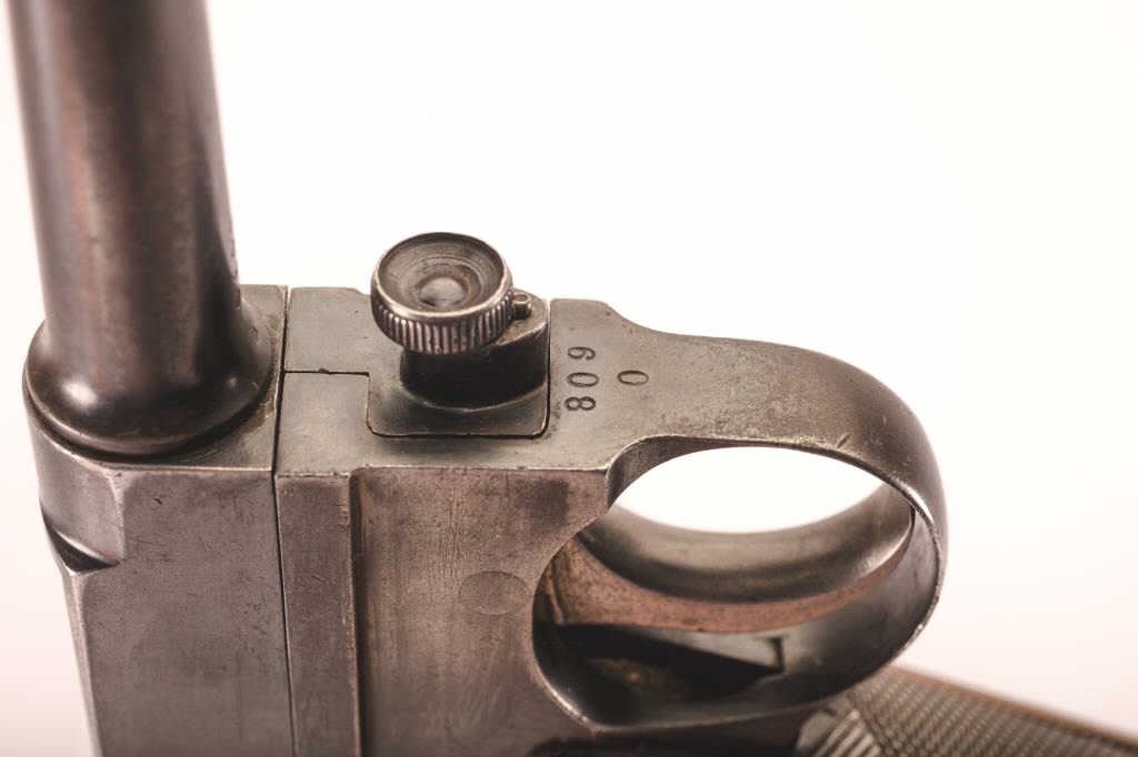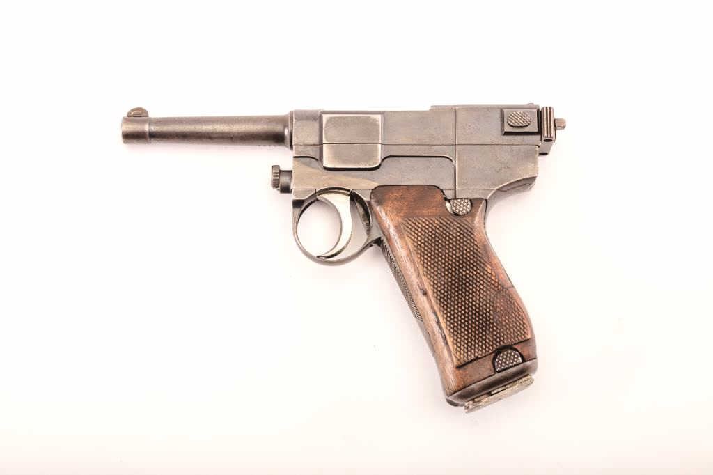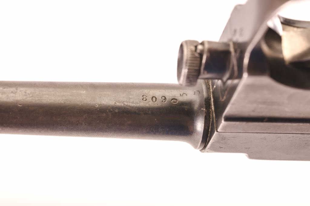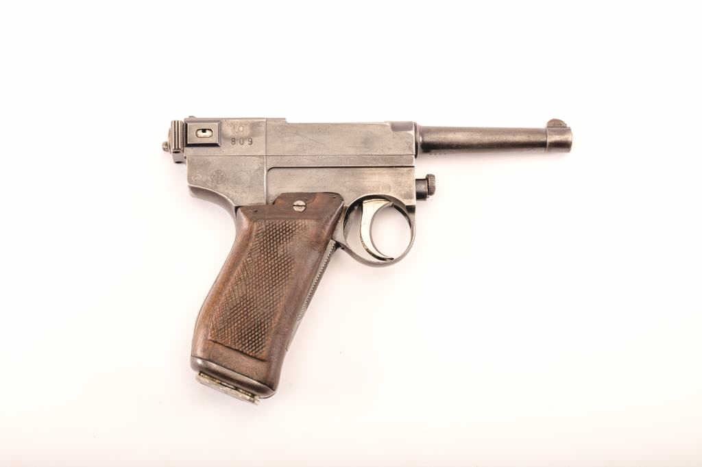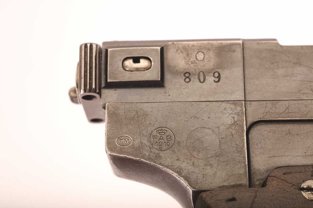 Italian Glisenti 9mm semi auto pistol F.A.B. marked and 1910 dated, S/N 809 (O) suffix or series. 75%-85% original blue. Normal wear and use with cleaning to the left side of the frame over trigger. Well done repairs togrips. Matching visible numbers. Good bore and interior. Scarce and collectible. (C&R) Est.: $700-$1400