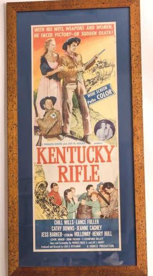 Original advertiser for film “Kentucky Rifle” starring Chill Wills circa 1950’s. Approximately 35x13”. Dated 1955, Howco Productions #55 of 182 only. Very good condition with minor folding and aging, hasgood color. Shows Kentucky used in earlier John Wayne films and sold in Walter O’ Connor auction. Nicely framed. Est.: $250-500