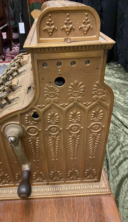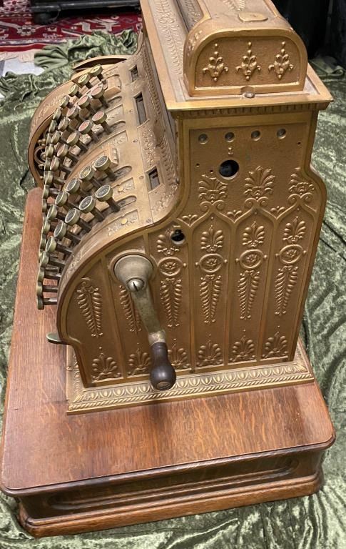 Fancy Brass cash register. $99.99 highest denomination. Measures 22 1/2" by 25" wide by 16" deep. Serial S111526. Turn of the century to 1920. Very good plus. Est.: $750-$1500